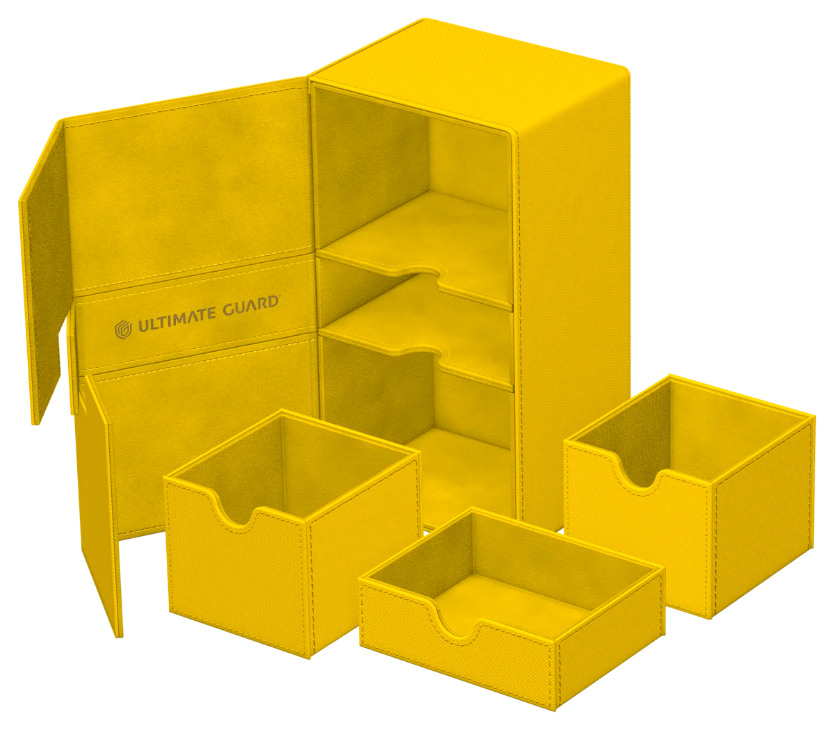 Catch the ultimate summer vibes with Ultimate Guard's Twin Flip'n'Tray 200+ Xenoskin from the limited "Summer Edition 2025" in four vibrant new colors: Dandelion, Peach, Lime and Lagoon! The Twin Flip'n'Tray deck box features two independently accessible trays with quality microfiber inner lining for 100 double-sleeved or 120 single-sleeved cards each. Additionally, the resistant Xenoskin box has a removable accessory tray and a strong magnetic closure to keep the Magic: The Gathering, Pokémon, Lorcana, One Piece or Yu-Gi-Oh! cards inside safe.