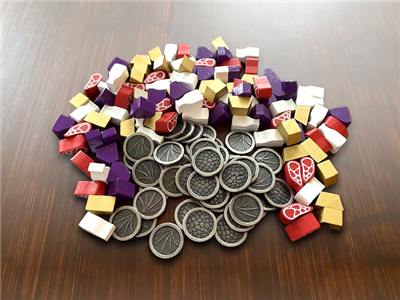 These 45 metal coins and 104 wooden resource tokens were designed specifically for Wyrmspan (the game includes cardboard tokens). All metal coins are identical, and there are 26 each of the resource tokens: meat, gem, gold, and milk.